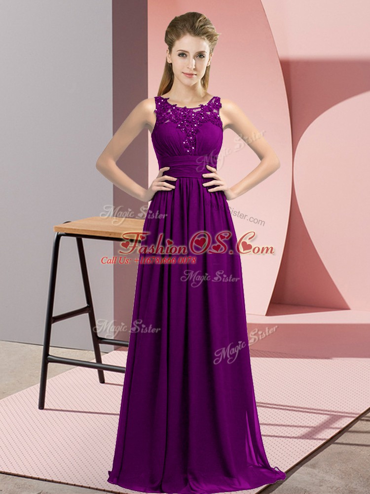 Sleeveless Floor Length Beading and Appliques Zipper Bridesmaid Dresses with Purple
