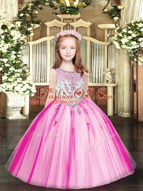 Sleeveless Floor Length Beading and Appliques Zipper Little Girls Pageant Dress Wholesale with Fuchsia