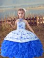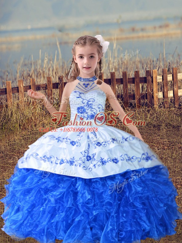 Sleeveless Floor Length Beading and Embroidery and Ruffles Lace Up Pageant Dress for Girls with Blue And White