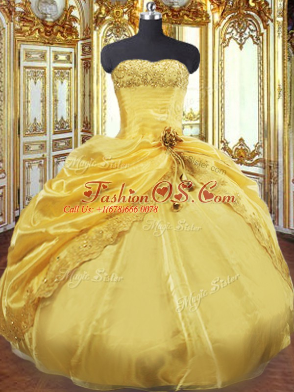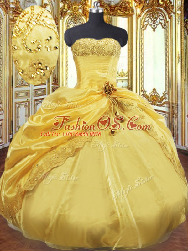 Home >  Quinceanera Dresses >  In Stock Quinceanera Dresses > Sleeveless Floor Length Beading and Pick Ups Lace Up Quinceanera Dress with Gold