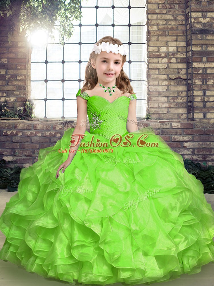 Sleeveless Floor Length Beading and Ruffles and Ruching Lace Up Little Girls Pageant Gowns with