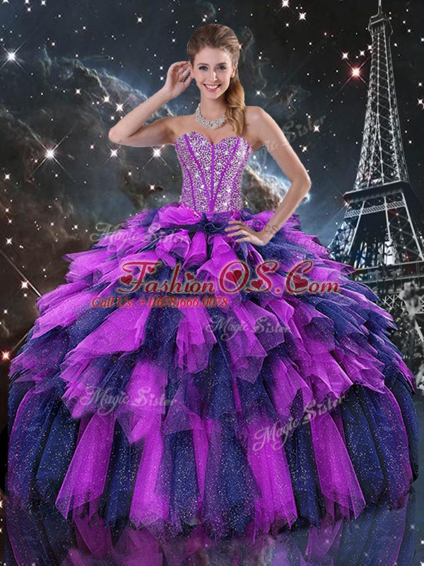 Sleeveless Floor Length Beading and Ruffles and Ruffled Layers Lace Up Ball Gown Prom Dress with Multi-color