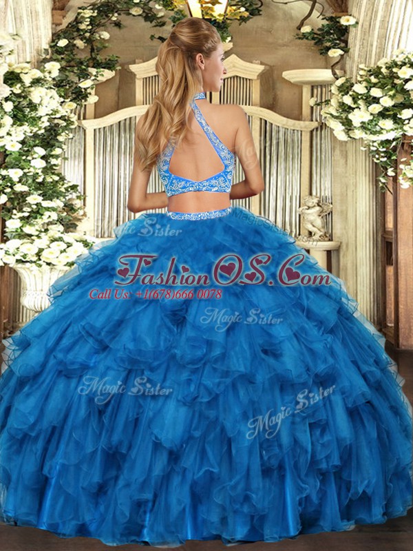 Sleeveless Floor Length Beading and Ruffles Criss Cross Sweet 16 Dress with Blue