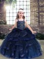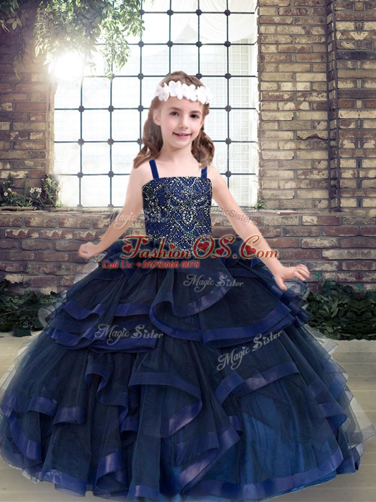 Sleeveless Floor Length Beading and Ruffles Lace Up Kids Formal Wear with Navy Blue