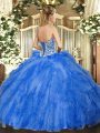 Sleeveless Floor Length Beading and Ruffles Lace Up Quince Ball Gowns with Fuchsia