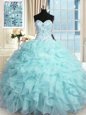 Sleeveless Floor Length Beading and Ruffles Lace Up Quinceanera Dress with Aqua Blue