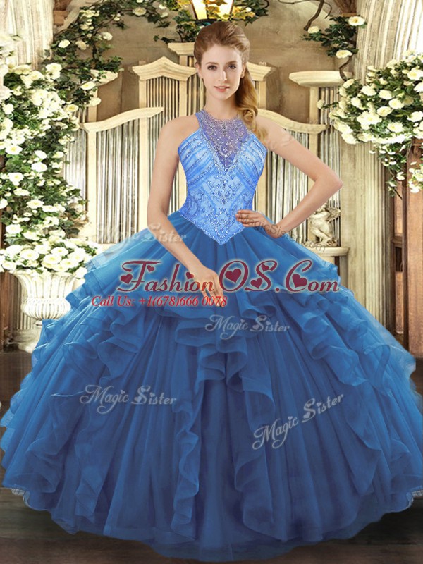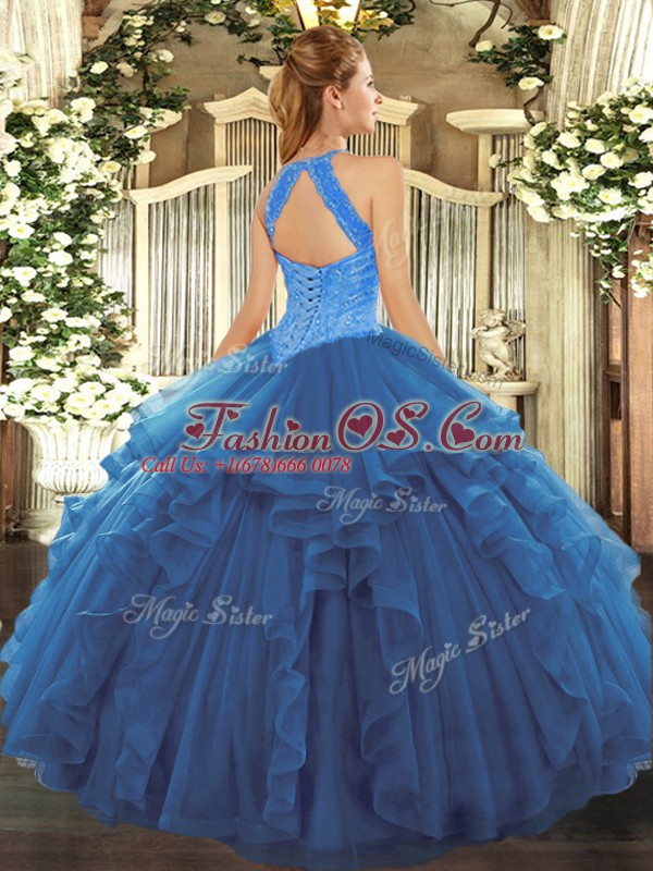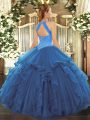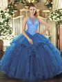 Sleeveless Floor Length Beading and Ruffles Lace Up Quinceanera Dress with Blue