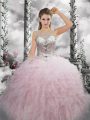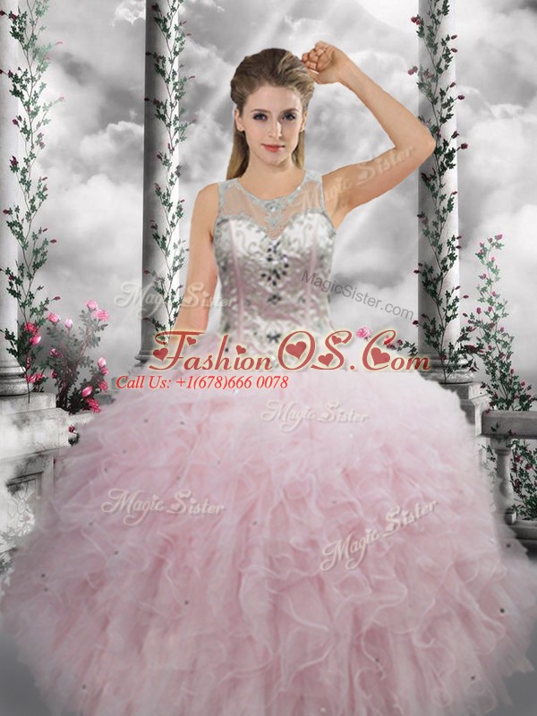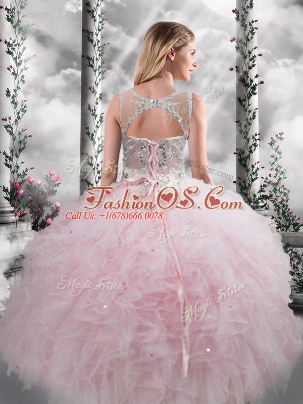 Sleeveless Floor Length Beading and Ruffles Lace Up Sweet 16 Dress with Baby Pink