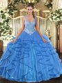 Sleeveless Floor Length Beading and Ruffles Lace Up Sweet 16 Quinceanera Dress with Baby Blue