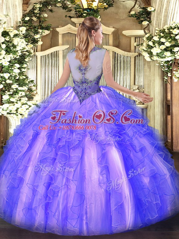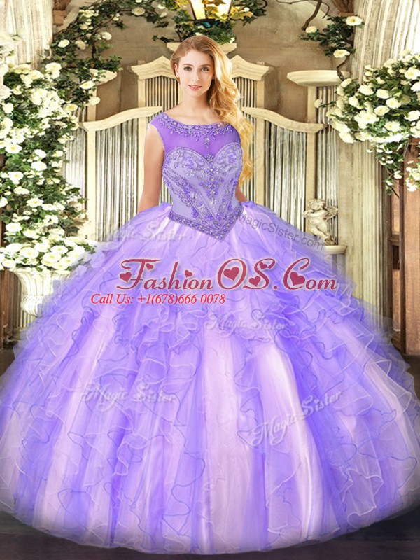 Sleeveless Floor Length Beading and Ruffles Lace Up Sweet 16 Quinceanera Dress with Lavender