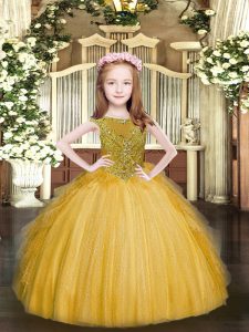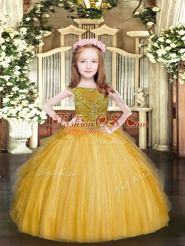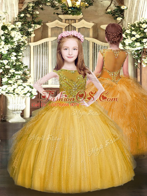 Home >  Special Occasion Dresses >  Pretty Little Girl Pageant Dresses > Sleeveless Floor Length Beading and Ruffles Zipper Girls Pageant Dresses with Gold