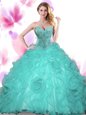 Home >  Quinceanera Dresses >  Puffy Quinceanera Dresses > Sleeveless Floor Length Beading Lace Up Quince Ball Gowns with Turquoise