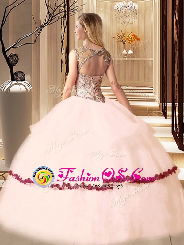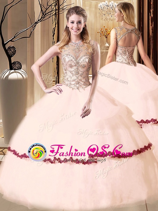 Sleeveless Floor Length Embroidery and Ruffled Layers Lace Up Vestidos de Quinceanera with Blue And White