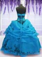 Sleeveless Floor Length Embroidery Lace Up Ball Gown Prom Dress with Blue