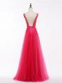Sleeveless Floor Length Lace and Appliques Backless Evening Dresses with Coral Red