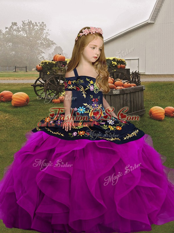Sleeveless High Low Embroidery and Ruffles Lace Up Little Girls Pageant Gowns with Fuchsia