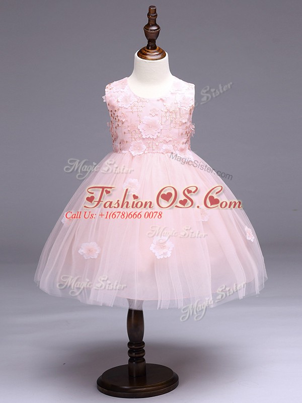 Sleeveless Knee Length Appliques and Bowknot Zipper Little Girls Pageant Dress with Baby Pink
