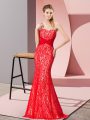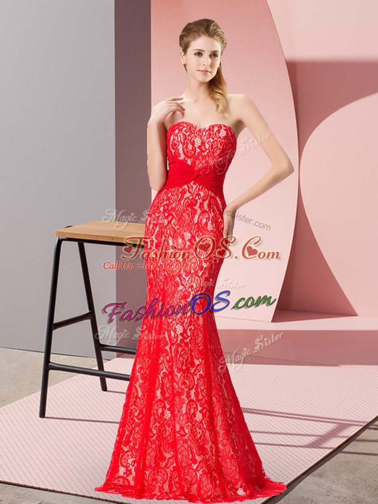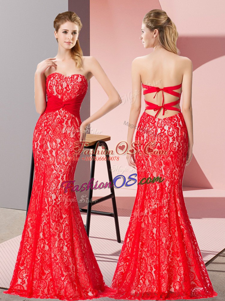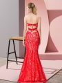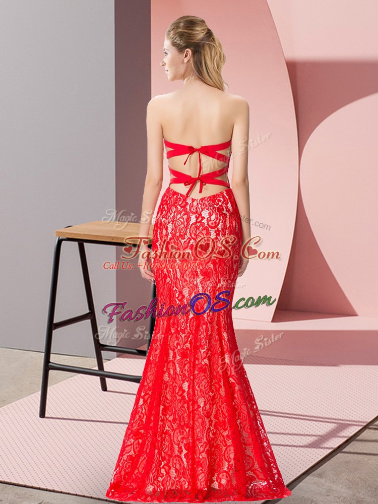 Sleeveless Lace Floor Length Backless Dress for Prom in Red with Beading