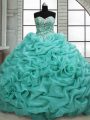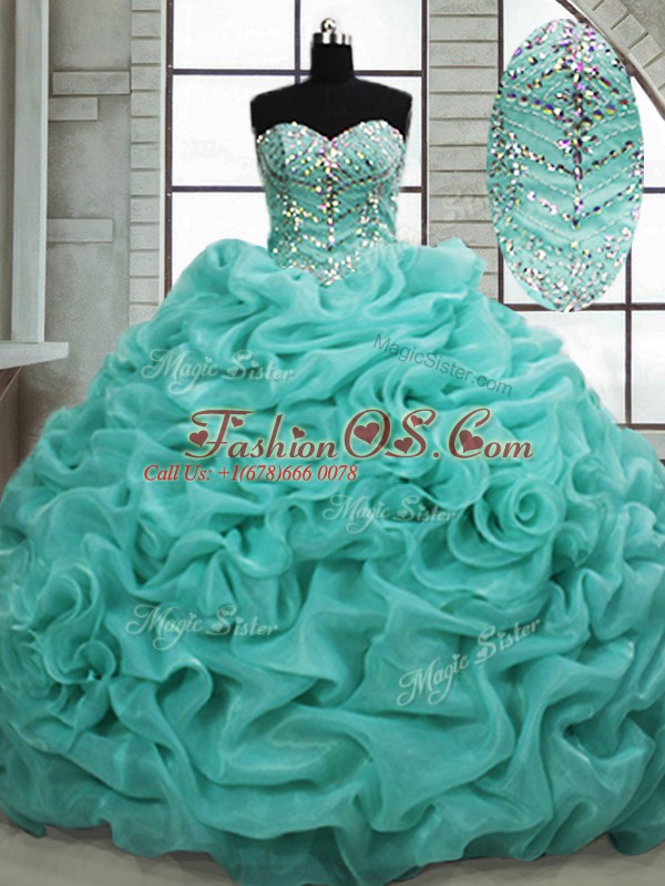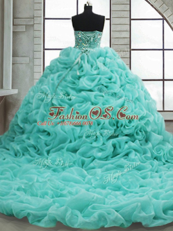 Home >  Quinceanera Dresses >  Fast Delivery Quinceanera Dresses > Sleeveless Organza Brush Train Lace Up Vestidos de Quinceanera in Turquoise with Beading and Pick Ups