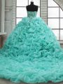 Sleeveless Organza Brush Train Lace Up Vestidos de Quinceanera in Turquoise with Beading and Pick Ups