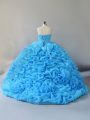 Home >  Quinceanera Dresses >  Perfect Quinceanera Dresses > Sleeveless Organza Court Train Lace Up Quinceanera Gown in Baby Blue with Beading and Pick Ups and Hand Made Flower