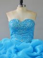 Sleeveless Organza Court Train Lace Up Quinceanera Gown in Baby Blue with Beading and Pick Ups and Hand Made Flower