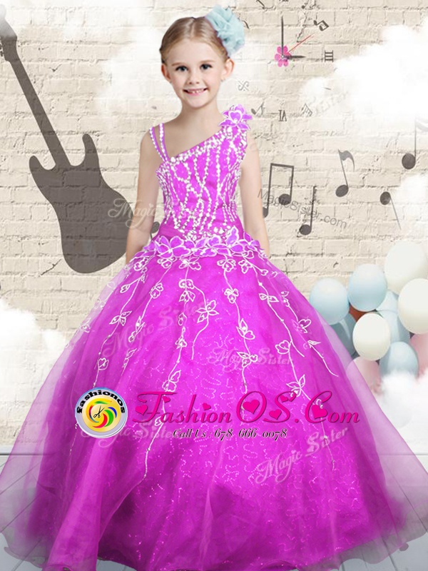 Home >  Special Occasion Dresses >  New Style Little Girl Pageant Dresses > Sleeveless Organza Floor Length Lace Up Girls Pageant Dresses in Fuchsia for with Beading and Appliques and Hand Made Flower