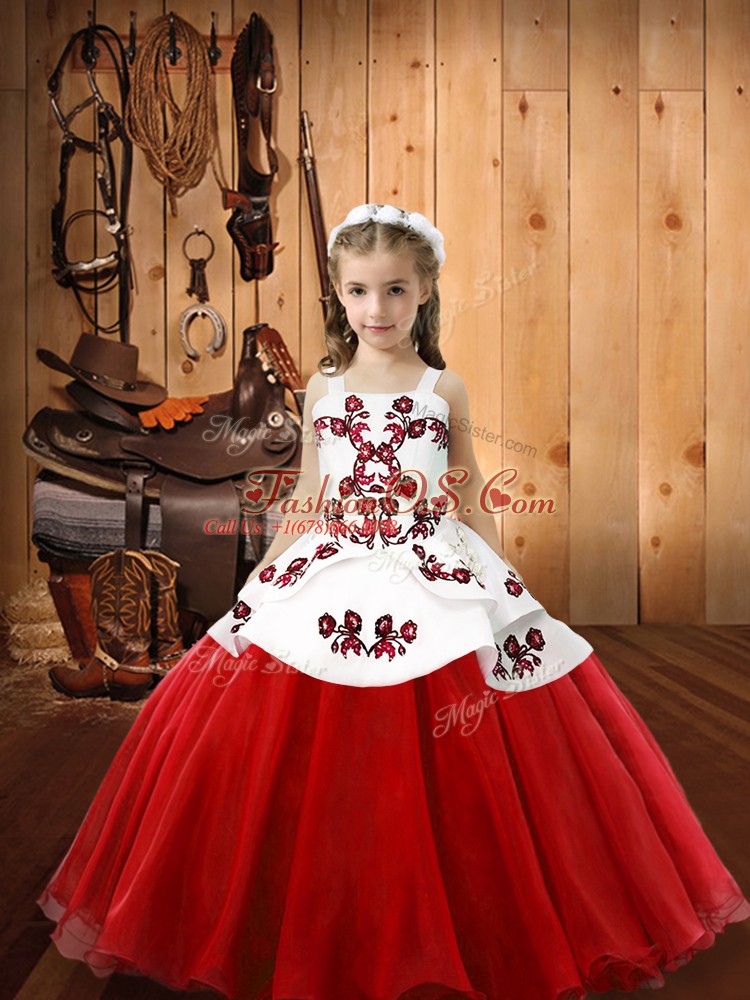 Home >  Special Occasion Dresses >  Lovely Little Girl Pageant Dresses > Sleeveless Organza Floor Length Lace Up Kids Pageant Dress in White And Red with Embroidery