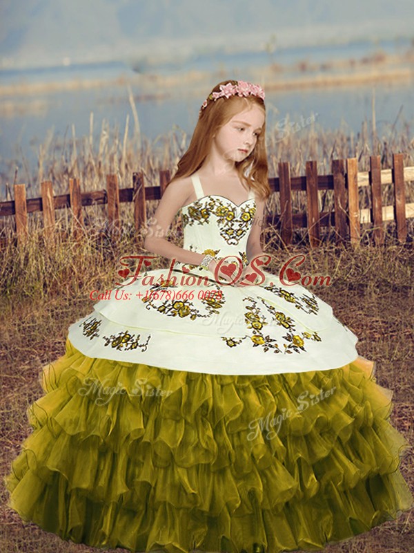 Home >  Special Occasion Dresses >  Lovely Little Girl Pageant Dresses > Sleeveless Organza Floor Length Lace Up Little Girl Pageant Gowns in Olive Green with Embroidery and Ruffles