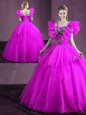 Sleeveless Organza Floor Length Lace Up Quinceanera Dresses in Fuchsia for with Appliques and Ruffles