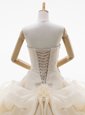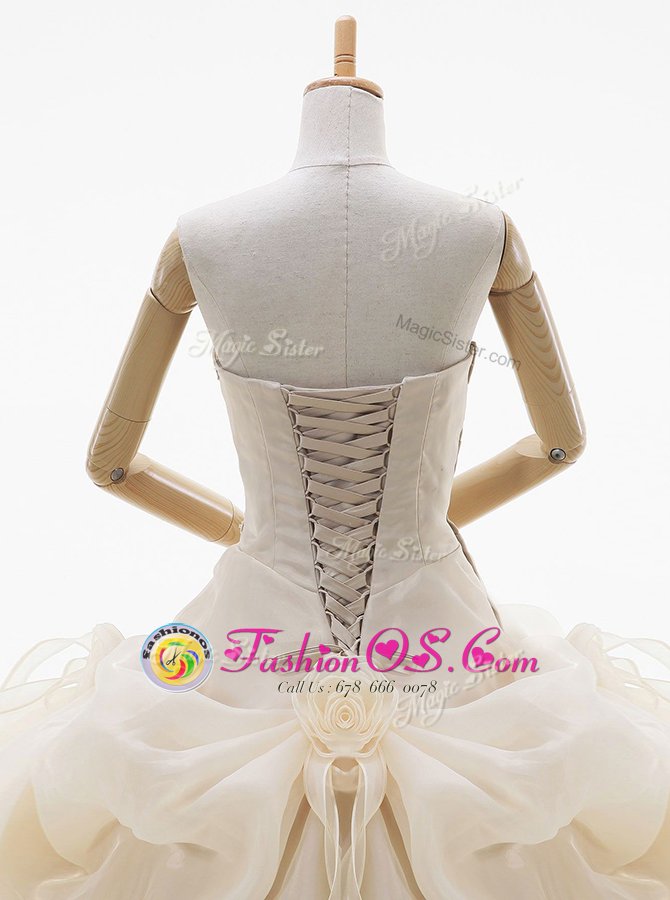 Sleeveless Organza Floor Length Lace Up Wedding Dresses in Champagne for with Appliques and Ruffled Layers and Pick Ups and Hand Made Flower
