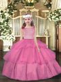 Sleeveless Organza Floor Length Zipper Little Girl Pageant Gowns in Pink with Beading and Ruffled Layers