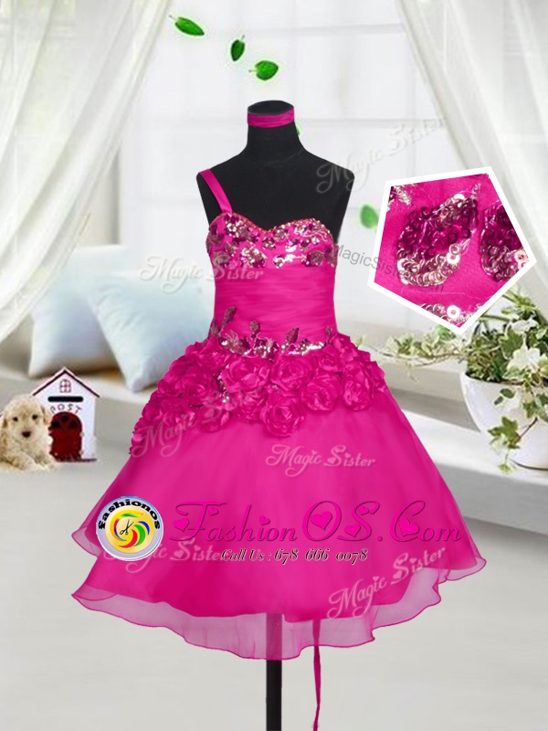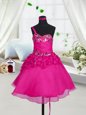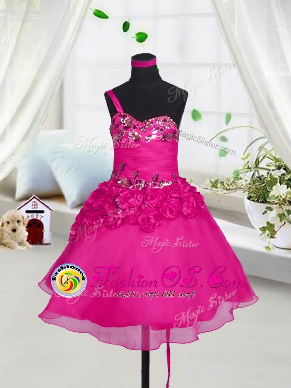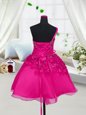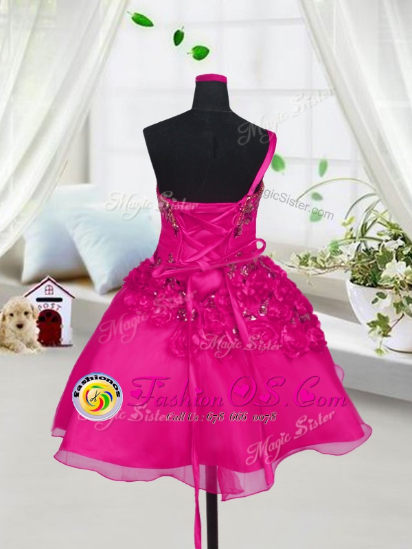 Sleeveless Organza Knee Length Lace Up Pageant Gowns For Girls in Fuchsia for with Beading and Hand Made Flower