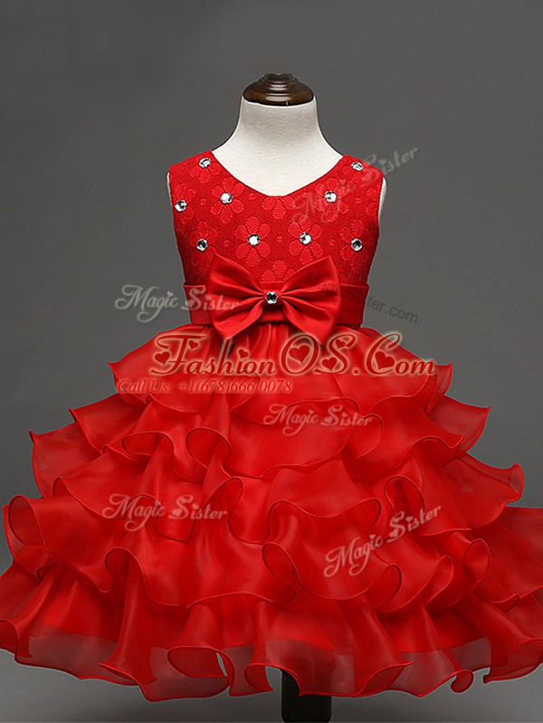 Sleeveless Organza Knee Length Zipper Kids Formal Wear in Red with Lace and Ruffled Layers and Bowknot