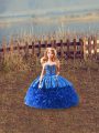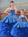 Sleeveless Satin and Fabric With Rolling Flowers Brush Train Zipper Quince Ball Gowns in Royal Blue with Embroidery and Ruffles
