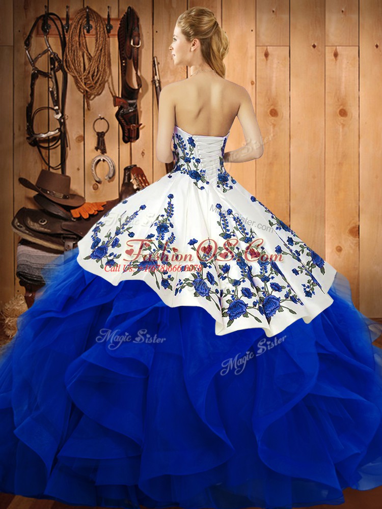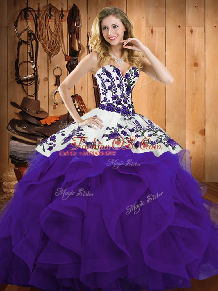 Sleeveless Satin and Organza Floor Length Lace Up Sweet 16 Dresses in Purple with Embroidery and Ruffles
