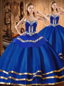 Sleeveless Satin and Tulle Floor Length Lace Up Sweet 16 Dress in Blue with Embroidery
