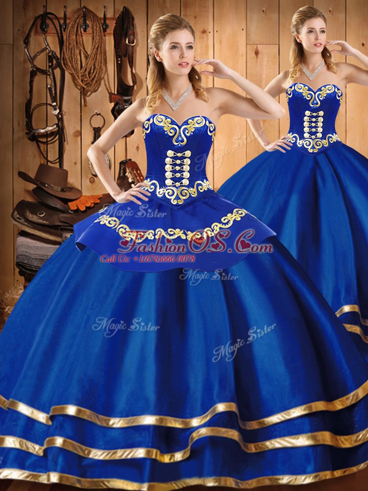 Home >  Quinceanera Dresses >  Detachable Quinceanera Skirts > Sleeveless Satin and Tulle Floor Length Lace Up Sweet 16 Dress in Blue with Embroidery
