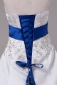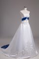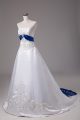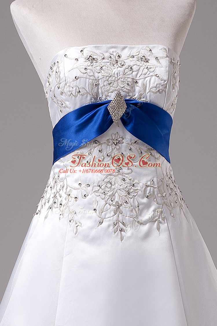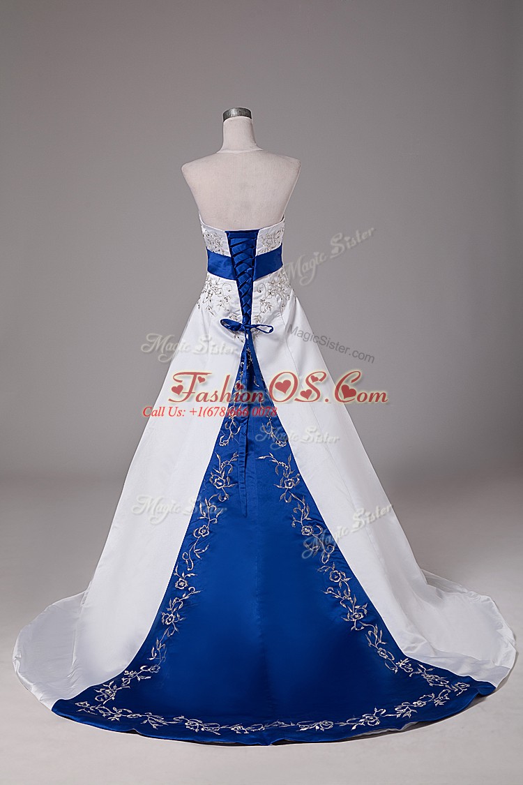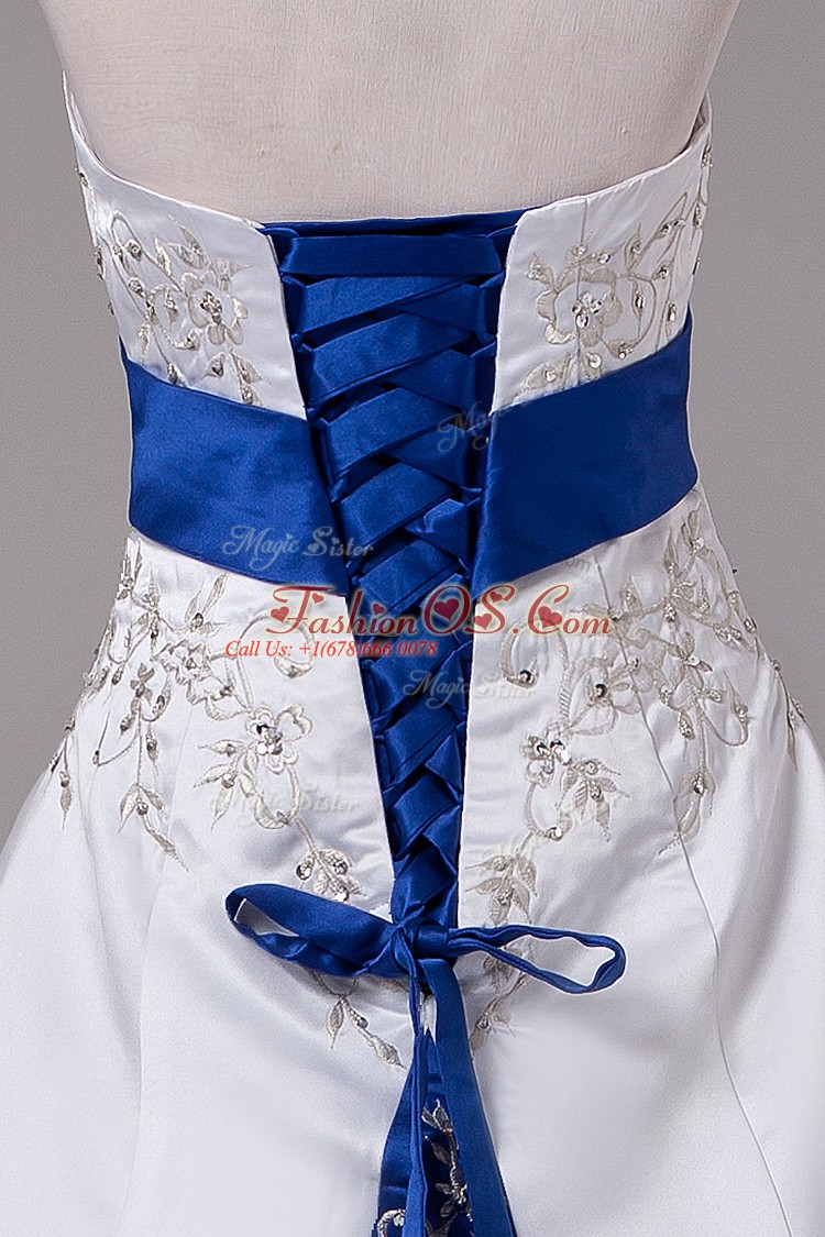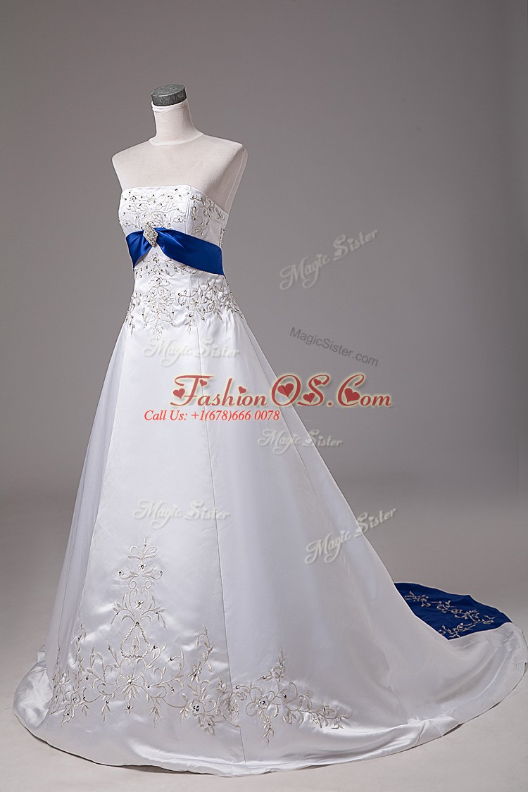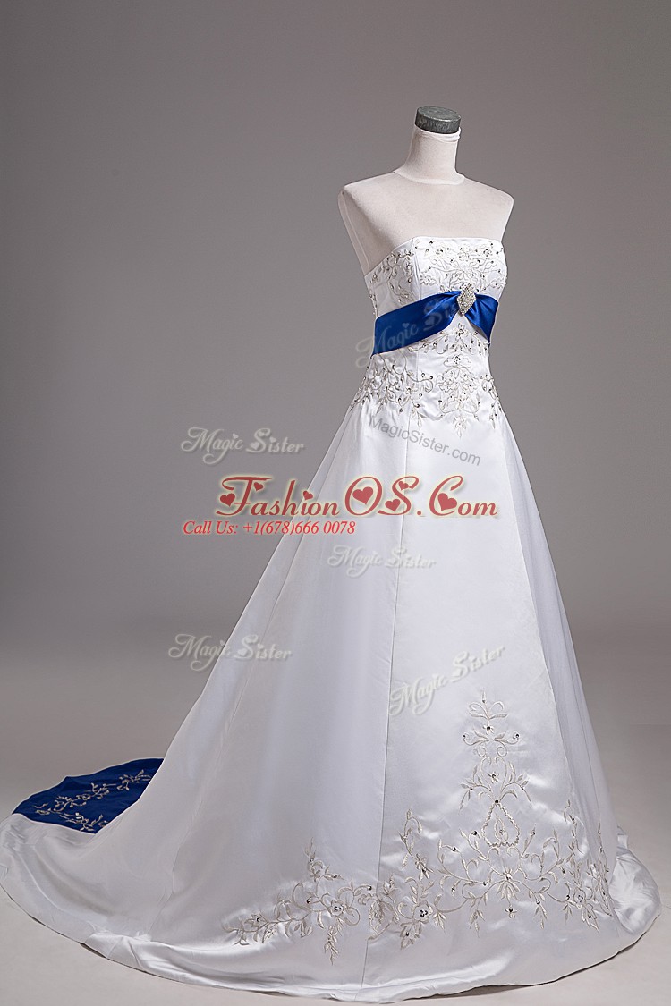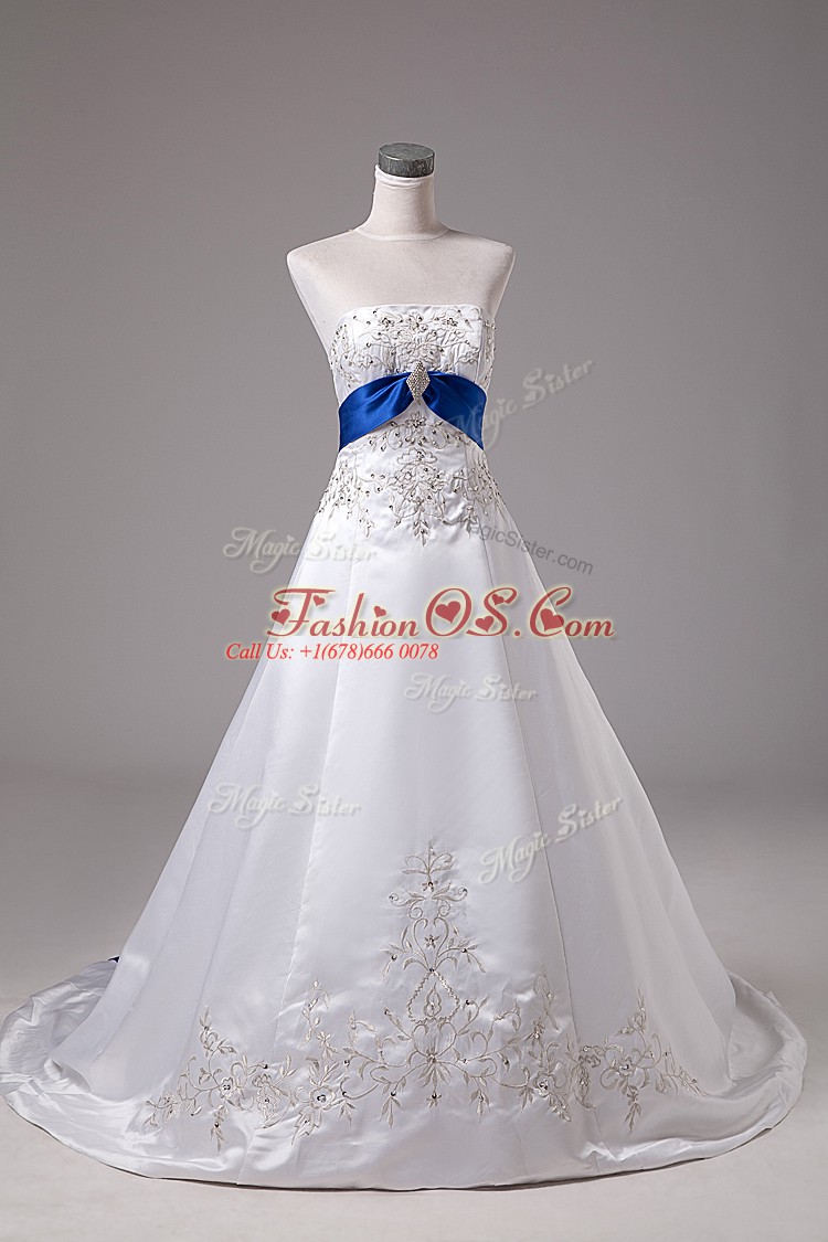 Sleeveless Satin Brush Train Lace Up Bridal Gown in White with Beading and Embroidery