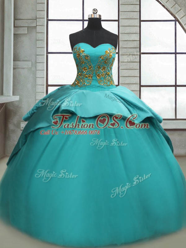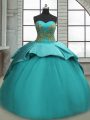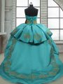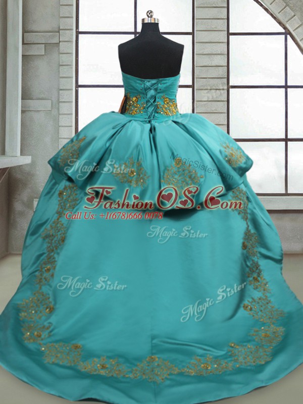 Sleeveless Satin Sweep Train Lace Up Ball Gown Prom Dress in Turquoise with Beading and Appliques