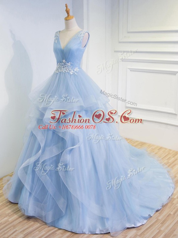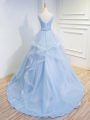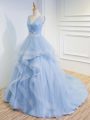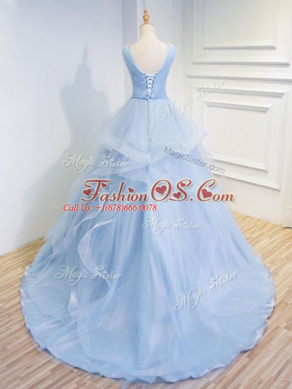 Sleeveless Tulle Floor Length Brush Train Lace Up Prom Dress in Light Blue with Beading and Ruffles