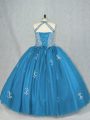 Sleeveless Tulle Floor Length Lace Up 15th Birthday Dress in Blue with Beading and Appliques