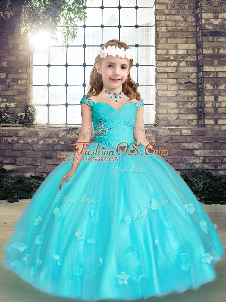 Sleeveless Tulle Floor Length Lace Up Child Pageant Dress in Aqua Blue with Beading and Hand Made Flower