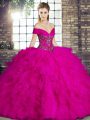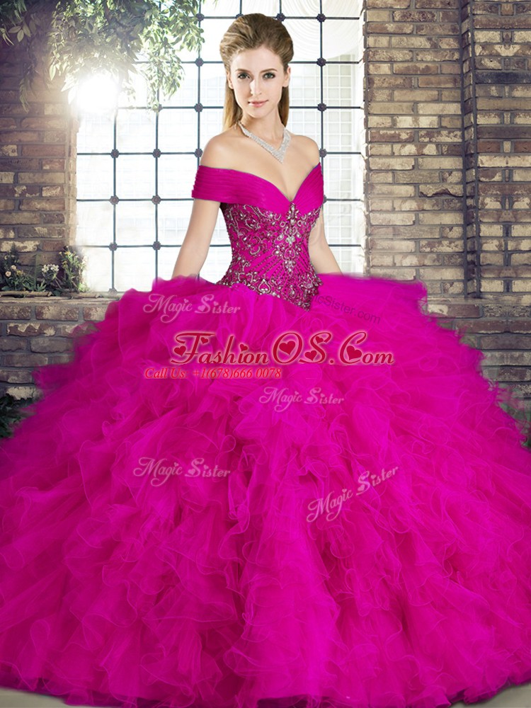 Sleeveless Tulle Floor Length Lace Up Vestidos de Quinceanera in Fuchsia with Beading and Ruffles