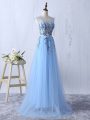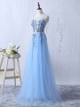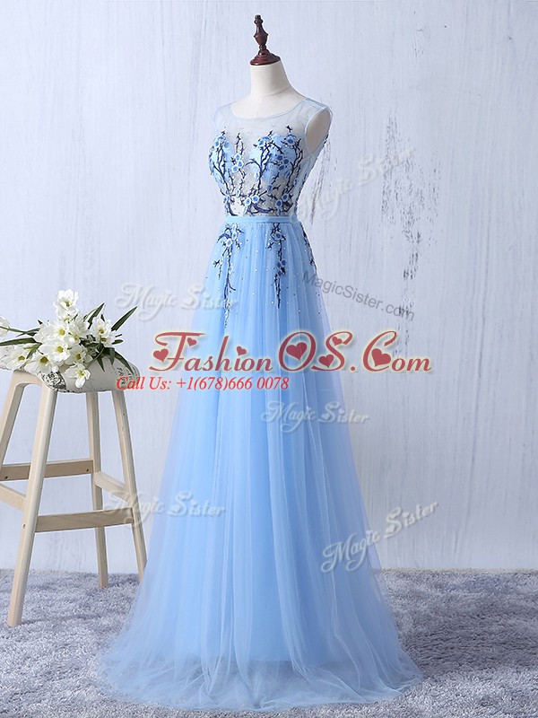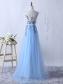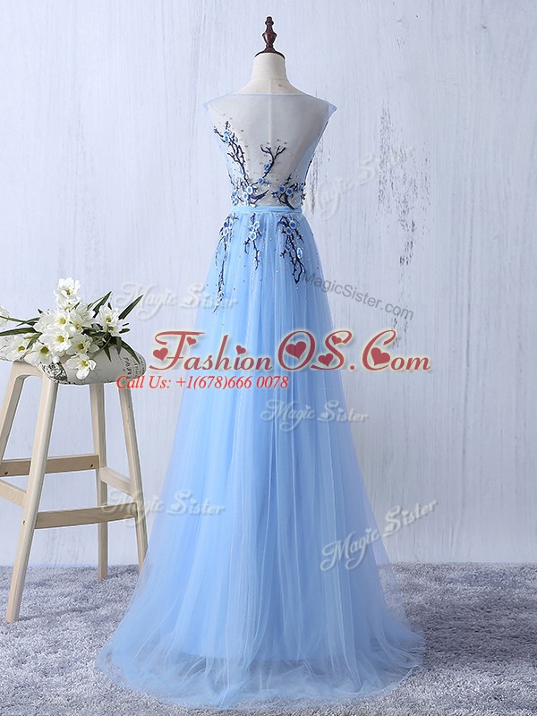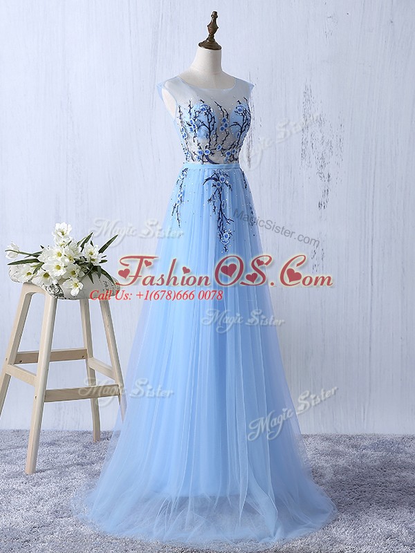 Sleeveless Tulle Floor Length Side Zipper Vestidos de Damas in Light Blue with Appliques