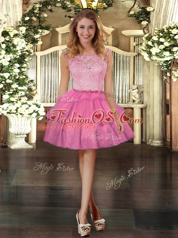 Sleeveless Tulle Mini Length Zipper Hoco Dress in Rose Pink with Lace and Ruffled Layers