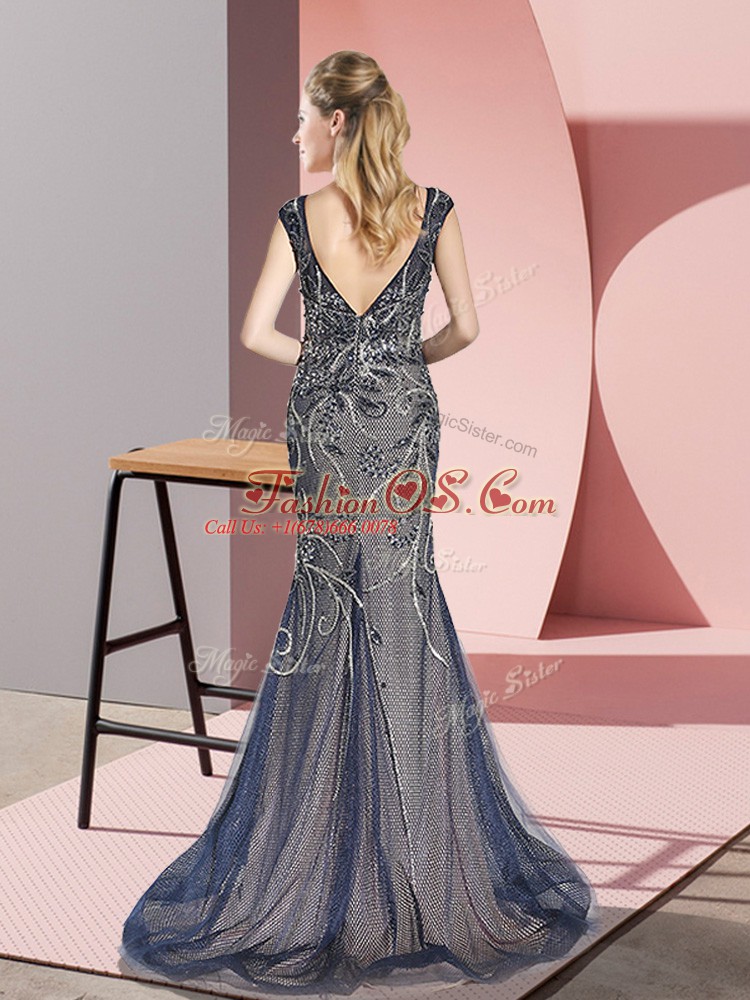 Sleeveless Tulle Sweep Train Zipper Prom Dresses in Green with Beading