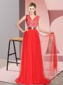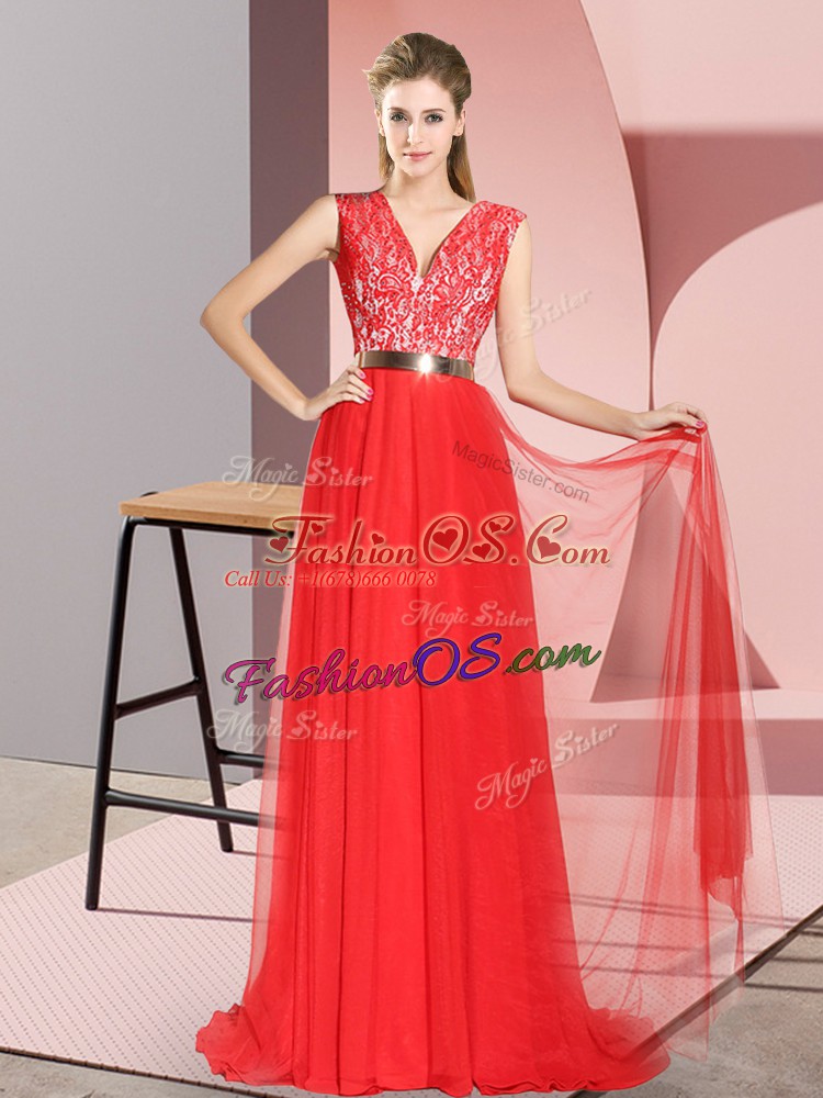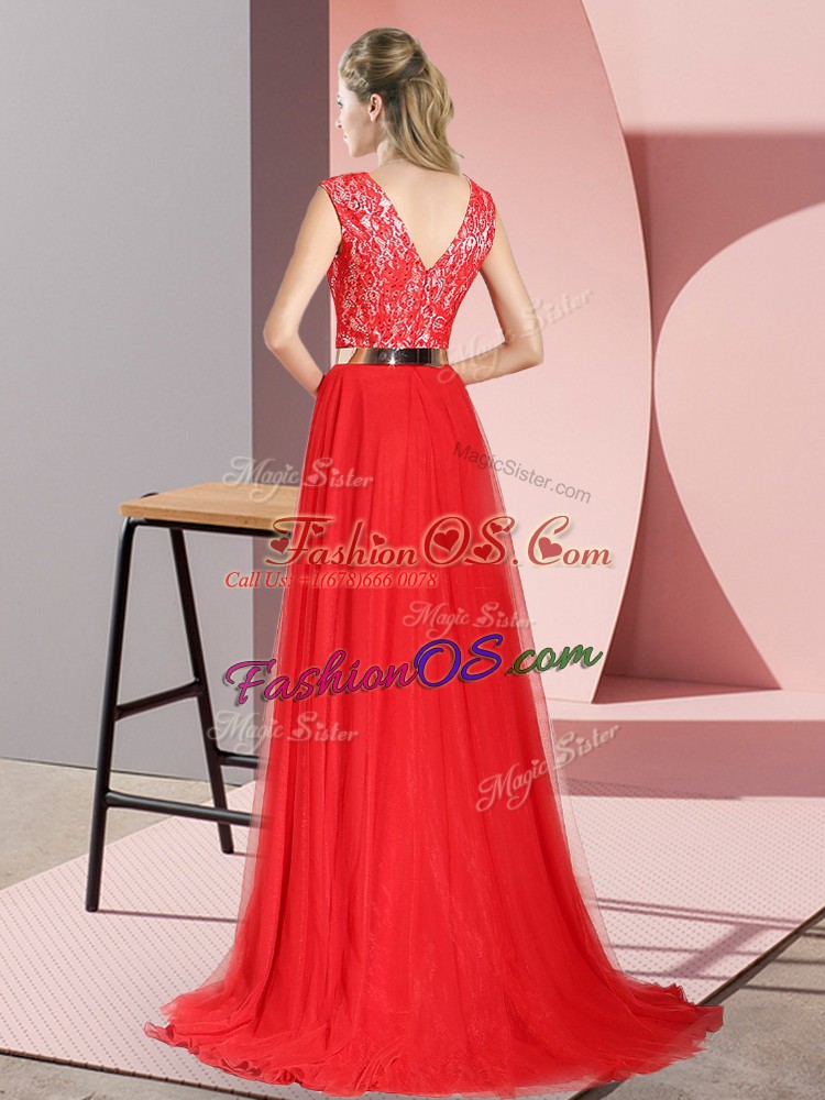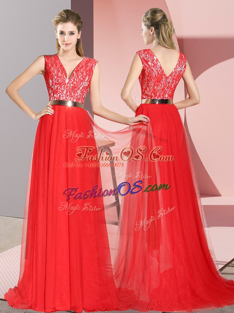 Sleeveless Tulle Sweep Train Zipper Prom Evening Gown in Red with Beading and Lace