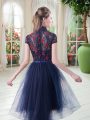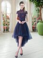 Smart Navy Blue High-neck Neckline Lace Prom Dresses Short Sleeves Zipper