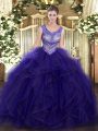 Smart Purple Ball Gowns Scoop Sleeveless Organza and Tulle Floor Length Lace Up Beading and Ruffles Sweet 16 Dress